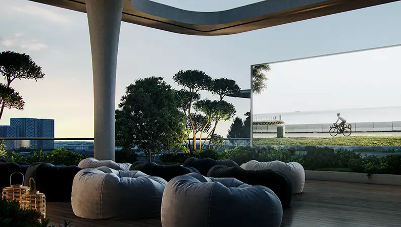Architecturally, the project embraces fluidity and harmony with its surroundings. Rounded balconies, stacked terraces, and expansive glass façades allow natural light to flow effortlessly throughout the interiors, creating a seamless connection between indoor and outdoor spaces. The design emphasizes privacy, openness, and uninterrupted views, fostering a peaceful and balanced living experience.